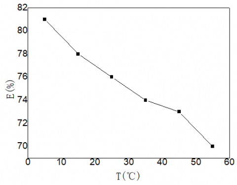 Removal rate of phenol at different temperatures of porous carbon is shown in Figure 5. It can be seen that the removal rate of phenol decreased with the increasing of temperature. The reaction was exothermic reaction. When the temperature was increased from 5℃ to 55℃, the removal rate of phenol decreased by 11%, which showed that the temperature had certain effect on the adsorption of phenol. The linear fitting results of porous carbon adsorption were obtained by the changes of the temperature and the relationship of the thermodynamic equilibrium constant and the Gibbs free energy, enthalpy change and entropy change, as shown in Figure 6 . As can be seen from the graph, the fitting equation is Y=882. 142X-1. 786, R2 is 0. 9427, the experimental result and the fitting degree of the linear equation was higher.