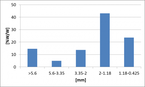 The straw used in this research has been produced at the end of June 2015, in the form of compacted bales of approximate dimensions, stored in a dry environment, cut by using a knife mill with a 2 mm square grid and finally characterized by ASTM sieves (Figure 4, Figure 5).