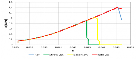 Figure 8 shows the stress strain diagram of a specimen with 2% of jute. The trend of the curve, representative of all the samples containing jute as filler, shows a first linear section, up to the inflection where there is the collapse of the sand/clay matrix, and a second linear one where the material presents a plastic behavior with a low increasing compression strength.