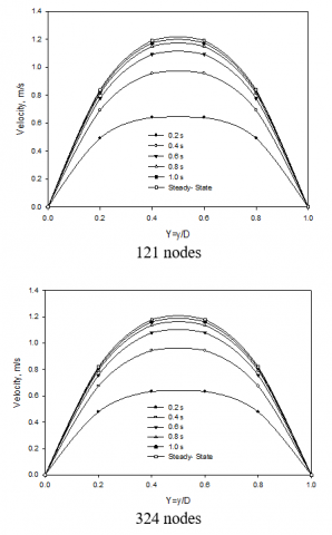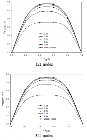 Figs. 6-8 show the progression of fluid velocity with time at different locations along the cross-section of the duct till the attainment of steady-state by the MLPG method for 121 and 324 nodes respectively.