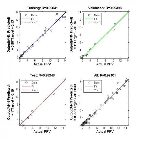 The vibration data collected were analyzed using the forest, ANN and scaled distance and predicted the of PPV and Correlation coefficient is calculated as shown in Table 3. Also, the analysis using scaled distance, ANN, the forest is shown in Figure 4, Figure 5 and Figure 6 respectively. Figure 4 is a plot between PPV and Scaled Distance as per scaled distance regression analysis which shows the power relation with correlations coefficient of 0.9429. Figure 5 is the representation of training, testing and validation of data using ANN with their correlation coefficients. Figure 6 is the report of random forest algorithms used for prediction of PPV with the collected data od PPV using D-cord.