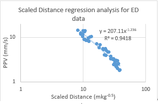 where K and n are site/ geological constant factors. The site factors are determined from a logarithmic plot of peak particle velocity (PPV) versus scaled distance (SD). The straight-line best representing the data has a negative slope n and an intercept K.