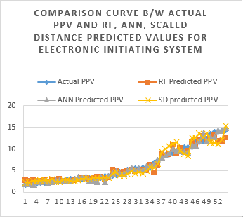 The predicted values of PPV using Scaled distance, ANN and random forest algorithm and actual values of PPV recorded for blasts using electronic initiating system is plotted on a same curve in Figure 15.