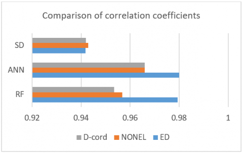 The analysis was made for different initiating system, i.e. Detonating cord, Nonel and Electronic initiation system using forest, ANN and Scaled distance regression analysis and the correlation coefficients obtained and presented below in Table 6 and Figure 16 below.