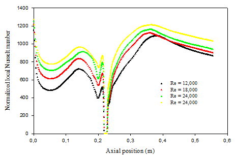 Figure 20. Profiles of normalized local Nusselt number as function of Reynolds number along the hot channel wall