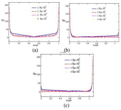 The local heat transfer rates on the boundary walls of the rectotrapezoidal enclosure can be defined in terms of local Nusselt number (non-dimensional number). They are numerically evaluated along the heated/cold wall(s) of the RT enclosure and are represented as enumerated below: