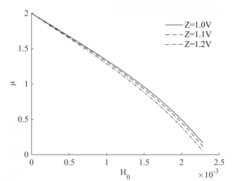 Figure 3 shows the relationship between the first passage time $\mu_1(H_0)$ and the total energy H0 of the system under different intensities of electrostatic excitation. As the total energy of the system increases, the first passage takes less and less time on average and will fail before the total energy reaches the right boundary. When the excitation intensifies, the total energy accumulation rate of the system will increase and will pass the safety domain earlier. In order to more clearly describe the first passage phenomenon, the drift and diffusion coefficients are substituted into the Kolmogorov backward equation to obtain the conditional reliability function R(t):