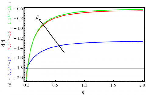 $\frac{{{a}^{2}}}{{{c}^{2}}}-f'(\eta )+\Pr f(\eta )\theta '(\eta )\text{+}f(\eta )f''(\eta )-g(\eta )f''(\eta )+f(\eta )g''(\eta )+\beta (-1+g'(\eta ))-g(\eta )g''(\eta ))+\theta ''(\eta )+f'''(\eta )+\lambda g'''(\eta )=0$