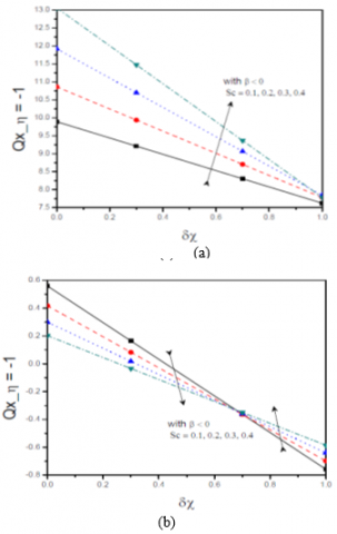 The variation of Qx at the lower and upper plates with $\delta \chi$ for different values of Lewis number Le is depicted in Figure 7. It is observed from these figures that Qx is decreasing with $\beta_{1}$ is negative and increasing with $\beta_{1}$ is positive at the lower plate and the similar pattern holds at the upper plate. Also, for a given Le, the Qx decreases as the $\delta \chi$ increase except at the upper plate with $\beta_{1}$ is negative.