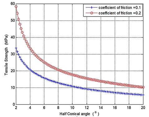 Figure 6. Plot of Tensile Strength against Half Conical angle at different frictional coefficient