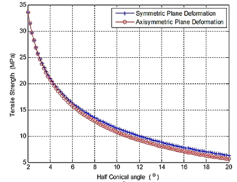 Figure 7. Plot of tensile strength against half conical angle for symmetric and axisymmetric plane deformation