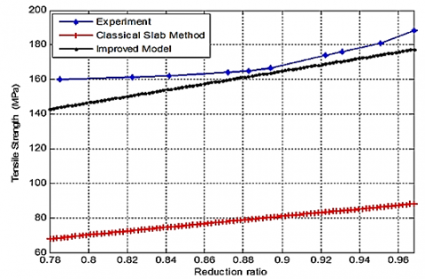 The plot of the experimental result and the results of the simulated model are represented in Figure 8. The result derived from the experiment is being compared with the model results both improved model and that from a classical slab. It was established that there is a close agreement between the improved model and the experimental results as both follow the same trends in a close range and this has validated the simulation of the improved model for tensile strength in wire drawing of aluminium alloy whereas there is a wide range when compared with the simulation form classical slab. It can be deduced that the simulation of the improved model is far better than that of classical slab simulation since there were close values of the experimental and the improved model, and this closeness is also in agreement with the work reported in by Rojas et al. [13] and Rubio et al. [18].