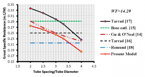 This expression didn’t show any response to the U-tube legs spacing variation between the two extreme cases, close together and along the outer wall of the borehole. Hence it reveals constant grout thermal resistance for normal operation of the U-tube ground heat exchanger regardless of the U-tube legs spacing.