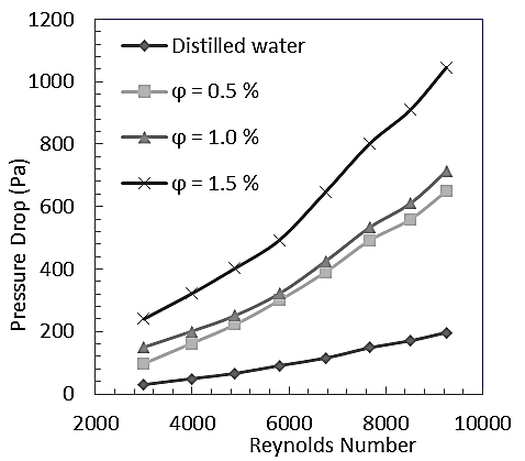 Volume concentrations of (φ=0.5%, 1.0%, and 1.5%) were selected to prepare the Al2O3 - distilled water Nanofluid and to study the effect of using different concentrations on the average Nusselt number and pressure drop in the test section. Table 2 presents the distilled water and Al2O3 nanoparticles Thermo-physical properties.