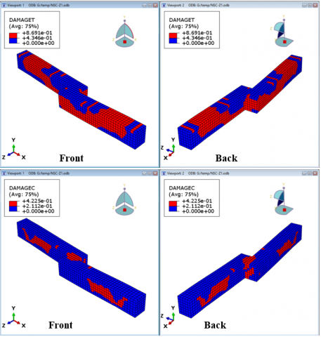 The crack patterns of the analyzed beams at the ultimate load are shown in Figure 8. The cracks in the FEA classified into two types, first one is the tension stress cracks that represented by DAMAGET, and the second one is the compression stress cracks that represented by DAMAGEC. The beam color is blue and cracking signs are observable with a red color.