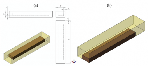 Figure 5. RVE model of WPC; fiber(brown), matrix(yellow). (a) full model with annotated multi-view projection. (b) actual physical domain used for simulation. ϕ, T and L are the width, thickness and length of the homogenised fiber respectively