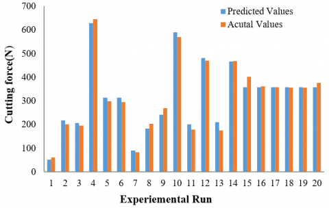 Figures 3, 4 & 5 shows that Predicted versus Actual cutting force for different cutting fluids with DI water as cutting fluid the cutting force are maximum for all experimental runs followed by neat cut oil and emulsified fluid. It is clearly observed that emulsified fluid is better cutting fluid than Neat cut oil and DI water. It is also observed that the predicted value of neat cut oil is very much similar to actual, and error is very minimal compared to DI water and Emulsified Fluid. In the case of DI Water, the cutting force is more than neat cut oil and Emulsified Fluid. Form this; it clears that using Emulsified Fluid, the cutting force value can be reduced to a maximum extent compared to DI water and neat cut oil.