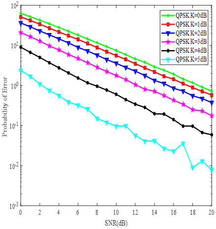 Figure 3. Signal to noise ratio vs probability of error for line-of-sight environments for different line-of-sight (KdB) factors for QPSK modulation scheme
