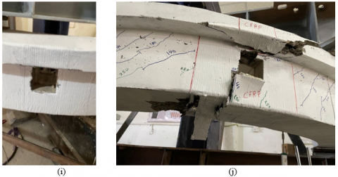 1. A clear increase was observed in ultimate load capacity of specimens with restored vertical opening (CB2.V60.S1 and CB3.V60.S2) by about (18.5% and 15.3%) respectively compared to that without restoring (CB1.V60), while for specimens with restored transverse opening (CB5.T60.S1 and CB6.T60.S2) were about (135% and 38.3%) respectively, as comparison to that without restoring (CB4.T60). The efficacy of using RPC hybridization or CFRP laminates as restoring technique can be noted. With regards to the mode of failure, no alteration was observed in specimen CB3.V60.S2, while for specimens CB2.V60.S1and CB5.T60.S1 with RPC hybridization were conversion from frame-type failure mode of specimens CB1.V60 and CB4.T60, respectively to flexural failure at positive moment near midspan. The mode of failure of specimen CB6.T60.S2 was converted to beam type failure at opening.