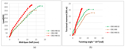 2. As Service mid-span deflection response, no obvious picture for specimens with restored opening, It ranged between increase and decrease when compared with the specimens without restoring. The service mid-span twisting was positively affected (decreased) for all restored specimens (CB2.V60.S1, CB3.V60.S2, CB5.T60.S1 and CB6.T60.S2) by about (55.28%, 13%, 10.73% and 2.37%) when compared with the specimens without restoring for vertical and transverse directions, respectively.