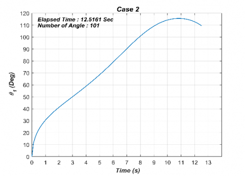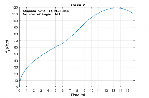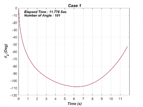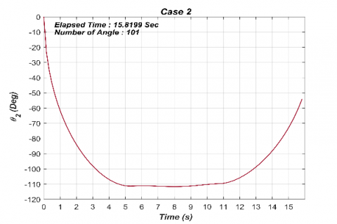 $\theta_{2}=\cos ^{-1}\left(\frac{l_{1}^{2}+l_{2}^{2}-R^{2}}{2 l_{1} l_{2}}\right)-\pi$ (7)