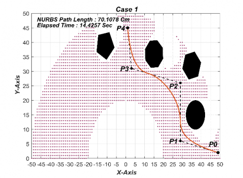 NURBS were suggested to find a possible collision free path from the start to the goal, in the presence of obstacles, chosen due to their flexibility as well as geometrical properties, and joined with the truth that the algorithms of the Non-Uniform Rational B-Splines being rapid and numerically steady. The NURBS permit the of geometric forms depiction in a compact shape and they're skillful at depicting the location of a point in the workspace [11].