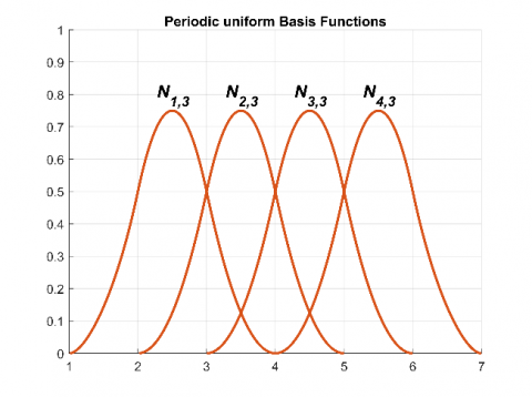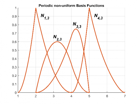Figure 4. Uniform and Non-uniform basis functions for (n + 1 = 5) and (k = 3) with Open and periodic Knot vector