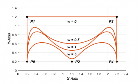 As being said earlier, the weights (wi) that work as further parameters govern the curve shape. It is easy to see in Figure 5 the weight (w2) effect upon the curve shape via governing the quantity of pulling that the point (P2) applies upon the curve. For weight (w2) equals to zero, the point (P2) possesses no influence. As the weight (w2) rises to (5), the curve gets further and further appealed to the (P2) [23].