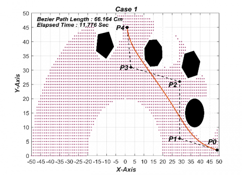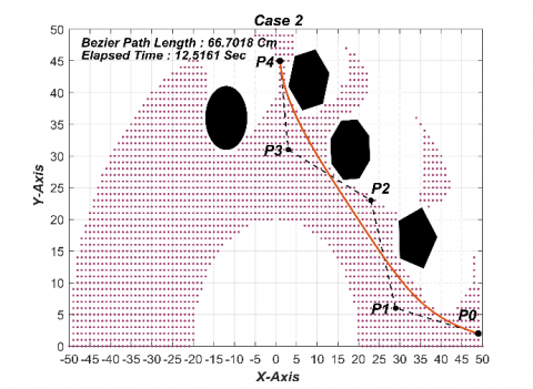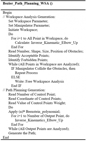 The difficulty of obtaining a possible collision free path, from the start to the goal, can be resolved via employing Bezier method; a no. of middle points within the acceptable area of the workspace shall be determined as well as utilized for the path planning. The Bezier path planning technique is illustrated in the Pseudo Code in Figure 6.