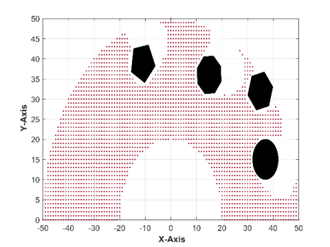 In the present research, the suggested path planning algorithms are comprised three parts. The first one is the workspace; robot cartesian workspace is described as a space made up of points that can only be attained via a specified end-effector configuration. Inverse kinematics was used to obtain these points that are associated with joint angles. However, as illustrated in Figure 8, the generation of free Cartesian space is limited by mechanical and geometric constraints, which affect and limit the motion of the robotic manipulator as well as split the workspace into acceptable and forbidden zones. The generation of free cartesian space can be achieved by analyzing all possible solutions for acceptable points in the environment, which are dependent on the obstacles collision checking function as revealed in the Figure 8 [29].