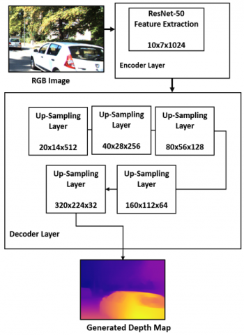 The general structure of the model is shown in Figure 3. Images consist of spatial information [22] which is minimized by down-sampling the H ×W ×c (c representing the number of channels) image once it gets delivered to the encoder to increase the network’s receptive field and decrease the computational operations. By applying the successive pooling and convolution layers, the image features are extracted. In this model, the encoder is based on the ResNet-50 backbone architecture. It consists of 50 layers with 48 convolutional layers, a max-pooling layer, and a 1 average-pooling layer. The Res-Net model is selected over other encoders such as VGG and DenseNet since it’s been shown that the sparse models tend to better perform in pruning than dense ones [23]. As a substitute for random weight initialization, transfer learning that uses cross-domain knowledge transfer is employed by pretraining the model on the ImageNet dataset since it demonstrated that it can drastically improve the performance of the depth prediction model without any observed downsides as illustrated by the Ref. [17]. The last classifying and average pooling layers of the encoder are discarded so that the decoder can be linked to the encoder with various configurations for the skip connection implemented for the preservation of the details between the decoder and the encoder. The decoding layer consists of 5 bilinear up-sampling layers to establish the depth estimation by up-scaling and fusing the output of the encoder gradually to construct the final depth map. As mentioned earlier, the decoder uses the bilinear method due to its straightforward design and smoother surface compared to the other methods such as the linear interpolation and the bicubic interpolation.