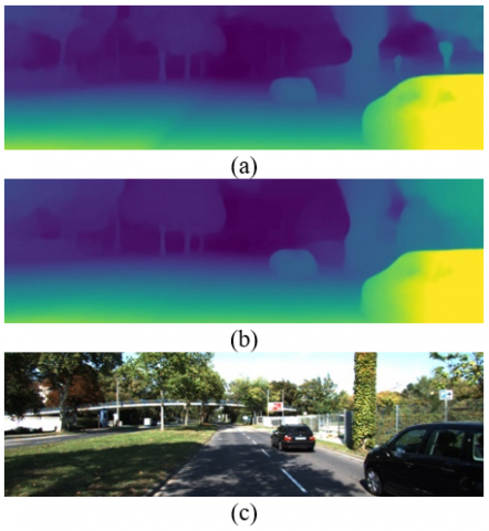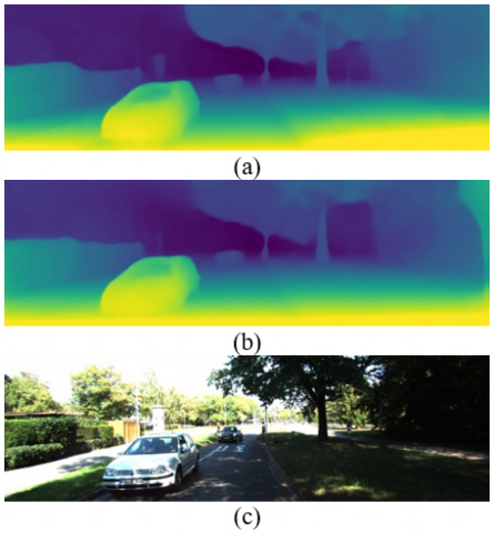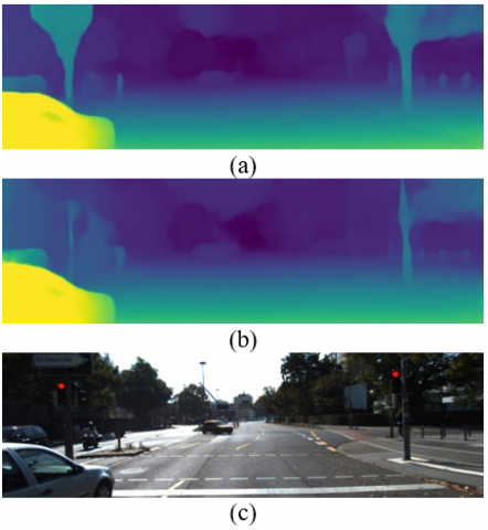 Figure 5. Qualitative depth prediction results on KITTI (a) Before pruning results (b) After pruning results (c) Original Image