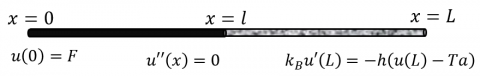 $\left\{\begin{array}{rlr}u^{\prime \prime}(x) & =0, & 0<x<l \\ u^{\prime \prime}(x) & =0, & l<x<L, \\ u(0) & =F, & \\ u\left(l^{-}\right) & =u\left(l^{+}\right), & \\ \kappa_{A} u^{\prime}\left(l^{-}\right) & =\kappa_{B} u^{\prime}\left(l^{+}\right), & \\ \kappa_{B} u^{\prime}(L) & =-h\left(u(L)-T_{a}\right)\end{array}\right.$ (1)