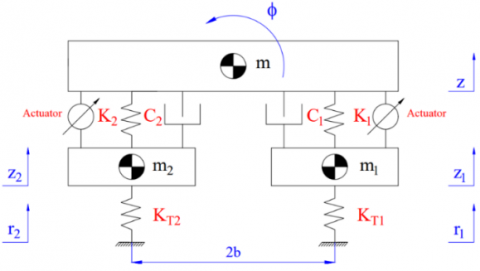 In this research, a half dynamics model is used to describe the vehicle's oscillations (Figure 1). Separating the sprung mass and the un-sprung mass, this model consists of four degrees of freedom.