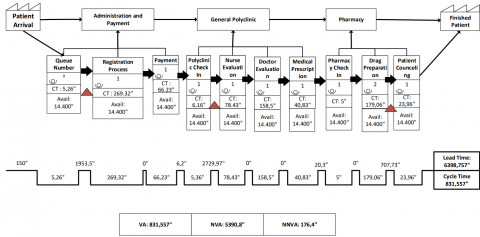 The general Polyclinic process at the Indonesian-community health center consists of ten processes which can be grouped into four parts, i.e. patient registration, nurse evaluation, doctor evaluation and pharmacy. Patients who come to the general polyclinic are divided into 2 types, i.e. general patients and national health insurance patients. General patients are patients who served with a cash payment system, while nation health insurance patients are patients who served based on an insurance form. The current service system has a lead-time of 1 hour 46 minutes and a cycle time of 13 minutes 51 seconds as seen in Figure 1.