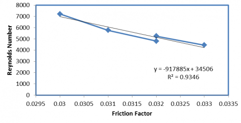 The relationship between the Reynolds number and the friction factor is seen in Figure 6. The data is fitted using a linear model with an R2 of 0.92.