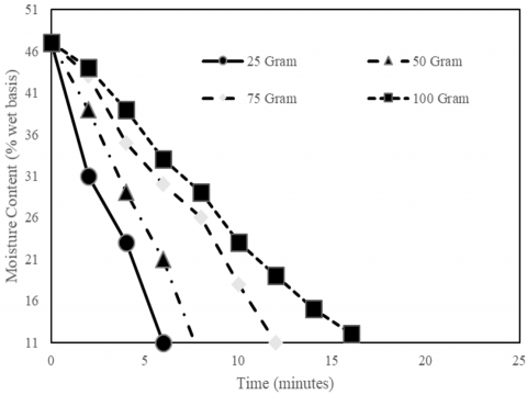 where, n is the multiplier of mass. For example, in a sample with a mass of 25 grams, 6 minutes is needed to reach the required moisture content. With Eq. (13), for a sample of 75 grams which is three times the initial amount, 12 minutes is needed to achieve a moisture content of 12% (wb).
