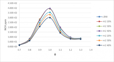 The benefits of improving the combustion of propane gas are also accompanied by negatives, as one of the most important negatives that accompany the process of improving the combustion of propane gas when adding improvement gases to it are harmful emissions to the environment such as NOX and CO gas. The value of NOX in the case of adding hydrogen gas reached 40% to 396 ppm, which is considered a very high percentage of harmful emissions to the environment in Figure 4. Also, when adding nitrogen gas, we get a lower value of emissions than in propane gas alone, where the percentage of NOX reached 300 ppm, which is relatively few and better in terms of damage. Environmental.