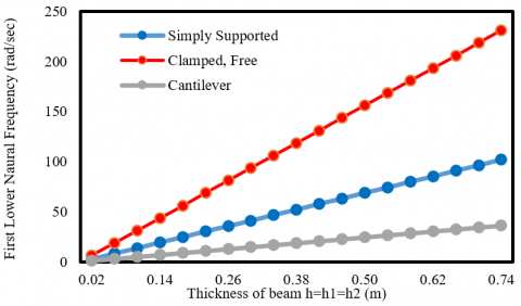 Figure 3 and Table 3 elucidated that for the clamped and free double beams, the higher natural frequencies decrease when the ratio (h/b) increases from 1 to 12 times. However, if the ratio is more than 12, the higher natural frequencies start increasing. The same behavior for the simply supported beam can be seen for the ratio (h/b) between 1 to 22 times, but the higher frequencies decrease with the increase in this ratio for more than 22 times. In the cantilever double beam, the higher frequencies also decrease with the (h/b) ratio increase. The behavior of lower natural frequencies (synchronous) with the changes in the values of thickness in the upper and lower beams (h1 & h2) is depicted in Figure 4 and Table 3. When the thickness increases from 0.02 to 0.38 m (h1=h2), the lower natural frequencies increase about 3000% in the simply supported beam and increase in the same ratio approximately 3000% in the clamped, free, and the cantilever beams. Consequently, the effect of the change in thickness on the higher natural frequencies (asynchronous) is higher in the simply supported, and the clamped, free double beams, but it generally causes an increase in those frequencies with the thickness increase in a cantilever beam. The increase in thickness of the upper and lower beams made a great increase in the values of the lower natural frequencies in all types of beams.