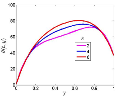 $\frac{\partial \theta}{\partial t}=\alpha\left(1+\frac{4}{3} R\right) \frac{\partial^2 \theta}{\partial y^2}+(r+\beta)-(r-\lambda) \theta$ (10)