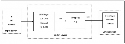 Figure 5 illustrates the architecture of the LSTM model which comprises ten inputs including ID, DLC, and Data 0-7. The hidden layers consist of an LSTM layer that counts 128 units with sigmoid as activation function and a Recurrent Dropout of 0.5 (R_D : 0.5). In addition to that, a dropout of 0.5 is set between the LSTM layer and the output layer to avoid overfitting. As for the DeepFNN, the output layer, in this case, contains also four neurons representing each class.