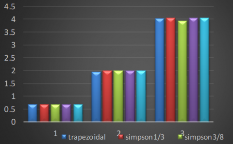 Discussions of numerical methods it's come near mtalab solutions in exact order, we see that each of the formulas is settled through the different methods as shown in the models. The different outlines start from dark blue trapezoid to the light blue MATLAB, arrangement in three stages with five solutions. In the first step when h=0.25 the main model on all methods have a small error ratio less than one, in the second step of second formula with Simpson at h=0.52 We estimate the best numerical arrangements near specified order, in stage 3 of the model third h=0.5 trapezoid and Simpson 1/3 move towards a small number of errors but less than accurate in solutions as Simpson 3/8, column shows the green color is less accurate number, MATLAB recorded the best digital union where it contains an error very simple with the ability of the algorithmic equation a single decimal error number.