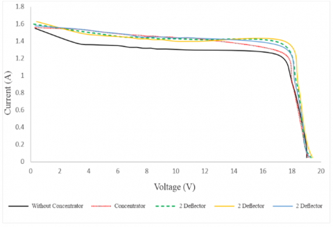 Photovoltaic panels that apply a variety of concentrator, concentrator with two deflectors, concentrator with four deflectors, and concentrator with six deflectors increase maximum power by 0.72 W, 2.48 W, 3.25 W, and 1.93 W at 1100 W/m2 radiation intensity and increase efficiency by 0.47%, 1.01%, 1.39%, and 0.61% at 950 W/m2 radiation intensity. Variation of the concentrator with four deflectors can increase the performance of the photovoltaic panel most optimally, namely at a maximum power of 24.50 W and efficiency of 6.77%.