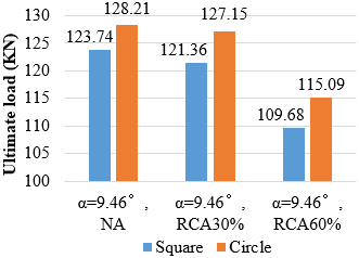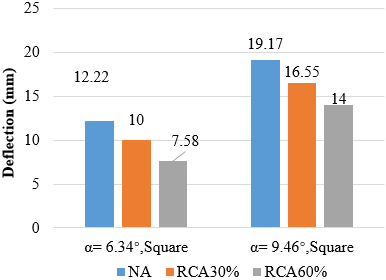 2. The ratio of increase in ultimate load and deflection of the model with normal concrete compared with the model with RCA 30 (regardless of inclination angle and opening shape) was (1.01-1.05) and (1.16-1.22), respectively. The ratio of increase in ultimate load and deflection was (1.11-1.16) and (1.33-1.61) compared with the model with RCA 60.