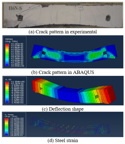According to ABAQUS software documentation, the damage region for tension and compression is described as substations parameters that are Concrete Compression Damage (dc) and Concrete Tension Damage (dt) in the Concrete Damage Plasticity Model (CDPM). The FE findings of crack patterns in the tension face of models that modeling in ABAQUS software gives good compatibility with the crack patterns obtained from the experimental findings after failure, as shown in Figures 15-17.