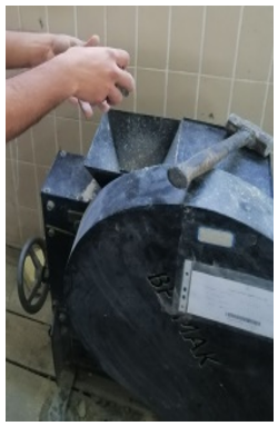 The utilized cement in this research is ordinary Portland cement (FALCON), which complies with Iraqi Specifications (5: 2019) [18]. The fine and normal course aggregate from the Jebel Sanam region in Basrah were used in the concrete mixes, and their characteristics were according to Iraqi Specifications (45: 1984) [19]. Waste materials from crushed concrete cubes were used to make recycled concrete aggregate (RCA). The RCA-graded material met the exact specifications of regular coarse aggregate in terms of particle size distribution. The rebar used in this study was manufactured in Ukraine, and the rebar of 10 mm in diameter was utilized for flexural and shear reinforcement. The concrete mixture's design has been done according to the American mix design method (ACI 211.1-91) [20] to get a compressive strength of 30 MPa (normal strength concrete). Two types of mix designs were used in this test, the first with natural coarse aggregate and the second with a recycled concrete aggregate of 0%, 30%, and 60% as a replacement for natural coarse aggregate. Where RCA was prepared through the two-stage crushing of destroyed concrete (from the pre-tested cubes), screening, and contamination removal. The technology used in the preparation of RAC is distinct from that used in the production of concrete with natural aggregate. Recycled aggregate has a noticeably higher water absorption rate than normal aggregate because of the mortar associated with it. The recycled aggregate must therefore be saturated with water before or during mixing to achieve the requisite workability of RAC. Figure 2 shows the crushing stages of RCA.