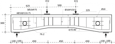 Tests were conducted on fifteen simply supported beams; see Table 1 Fourteen beam specimens were Haunched Beams, while one beam specimen employed as a prismatic (control) beam. The dimensions (length, width, and depth) of the total number of specimens were kept constant (1750 × 200 × 300 mm), and the test was conducted under a two-point load. The variables were the presence or absence of openings (square or circular), the angle of inclination of the beams (6.34°, and 9.46°), and the type of the used aggregate, Normal Aggregate (NA), and Recycled Concrete Aggregate (RCA). For a haunch angle of 6.34° and 9.46°, the vertex reinforcement space was 100 mm and 75 mm, respectively. Figures 3 a-d show details of reinforcing. All the top and bottom tension-reinforced bars (flexural) of all the tested beams, and the span and strength of concrete, were kept constant in Figure 4, beam details as well as the detail of space between the stirrups for all type of models are shown. It is essential to mention that the tested beams were designed to ensure shear failure.