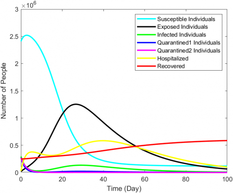 In the same way, it can be obtained that $E(t)>0, I(t)>$ $0, Q_1(t)>0, Q_2(t)>0, H(t)>0$, and $R(t)>0$. Then the solution of $S(t), E(t), I(t), Q_1(t), Q_2(t), H(t)$, and $R(t)$ of the dynamic model (1) are positive for every $t>0$.