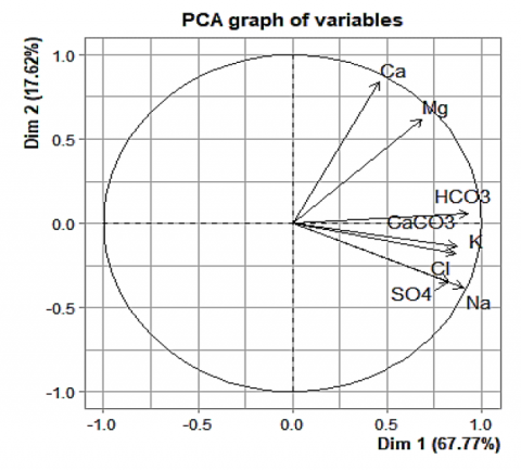 The high cos² of the variables HCO3, CaCO3, Na, K, Cl and SO4and of the variables Mg and Ca indicate a good representation of the variables on the main axis Dim1 and the main axis Dim2 (Figure 6 and Table 6), respectively. In this case, they are positioned near the circumference of the correlation circle. They are more important to interpret these two principal components.