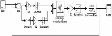 Figure 14 depicts the block diagram for the 49-Rule FC. While G1=2.5, G2=0.4, and G3=4, the tuned gains (scaling factors) are: G2=0.4, G3=4. Figure 15 depicts this controller's step response.